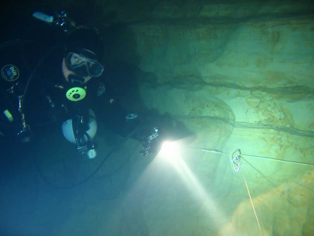 Wir folgen der Leine und jeder von uns hat diesen Tauchgang bereits als Übungs-Tauchgang verbucht, da die Sicht nicht merklich besser wird. So haben wir auch leider gelegentlich Bodenkontakt bzw. hörbaren Deckenkontakt mit den Doppelgeräten oder den Stages.