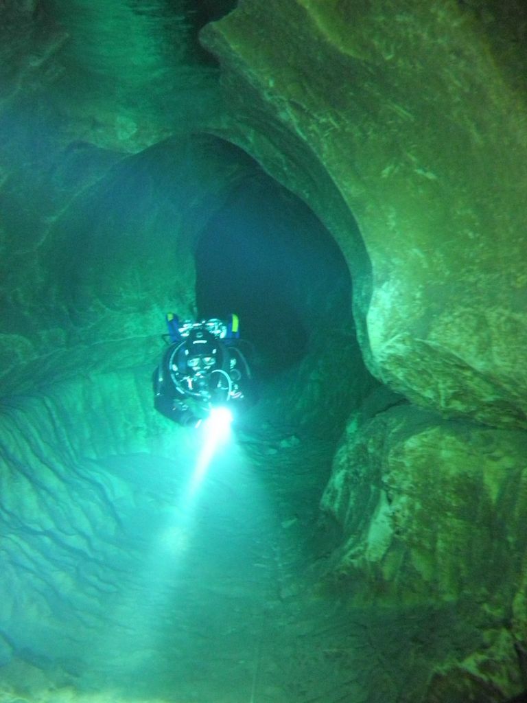Mit kleiner Standardausrüstung - D10 Luft + EAN 40 Stage machen wir uns auf den Weg zur Wiedereingewöhnung. Die Cele hat viel Wasser und ist klar aber rostrot. Am Eingang vor der Höhle ist es klar, auf den ersten 50m in die Höhle rein doch wahrscheinlich durch Schulung recht aufgewühlt. Ab dem großen Block mit dem dunklen Schieferinlett wird die Sicht besser und bei 190m am 1.T richtig gut (10-15m). Wir nehmen den tiefen Gang. Hinter uns schöne Lichtspiele - 4 HID-Lampen der Italiener. Wir gehen an den Rand und lassen sie vorbei - die haben's eiliger. Nach dem 2.T bei 350m noch ein paar 10m bis zum langgezogenen Schacht. Bei super Sicht schweben wir über dem Abbruch, gehen dann aber nicht mehr runter. Für den ersten Höhlen-TG des Jahres reicht es. Ein kurze Verbindungsleine die oben rüber zum flachen Gang führt ignorieren wir und schwimmen zum 2. T zurück. Langsam hoch und in einer Loop den flachen, aber etwas längeren Weg zurück. Nach 70 Minuten sind wir wieder im Tageslicht.