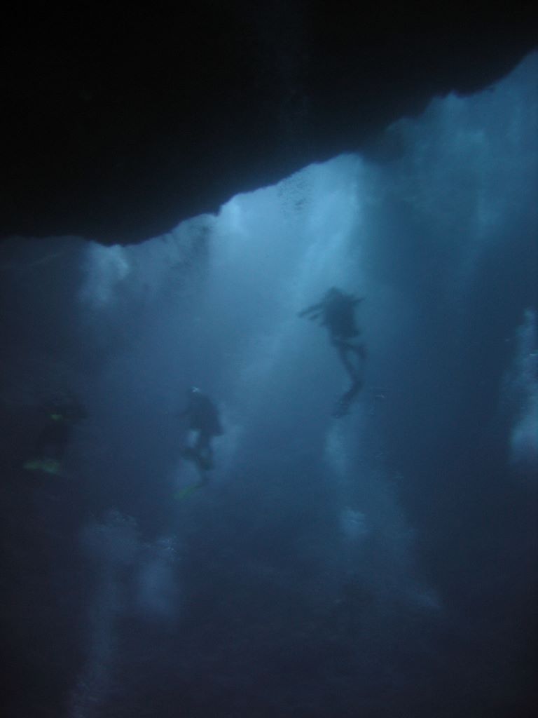 Blue Hole: Riesige Halle mit vielen großen Fenstern in Decke und Front. Einstieg auf 15m oder 25m. Unten läuft der Sandgrund steil schräg abwärts raus auf 40m. In der domartigen Halle hängen 30 Taucher auf verschiedenen Tiefen über uns. Vorhänge aus Blasen und dämmriges blaues Licht verleihen der Szene eine mystische Stimmung. In der Höhle und an den Fenstern einige wenige Fächerkorallen. Unten auf der Schräghalde in 30m rechts ein 1m hoher und 3m breiter Eingangsspalt. bewachsen mit Weichkorallen. Dort drinnen geht es weiter runter (Schildkrötenskelett?). Nach 20 Minuten verlassen wir das hole und tauchen die Wand nach links lang zum "blue corner" vor. Unterwegs schon einige WSR und GRH. Je näher wir zur Ecke kommen, desto stärker wird die Rückenströmung. Wir haken uns einige Zeit ein und beobachten die in geringer Entfernung patrolierenden GRH.